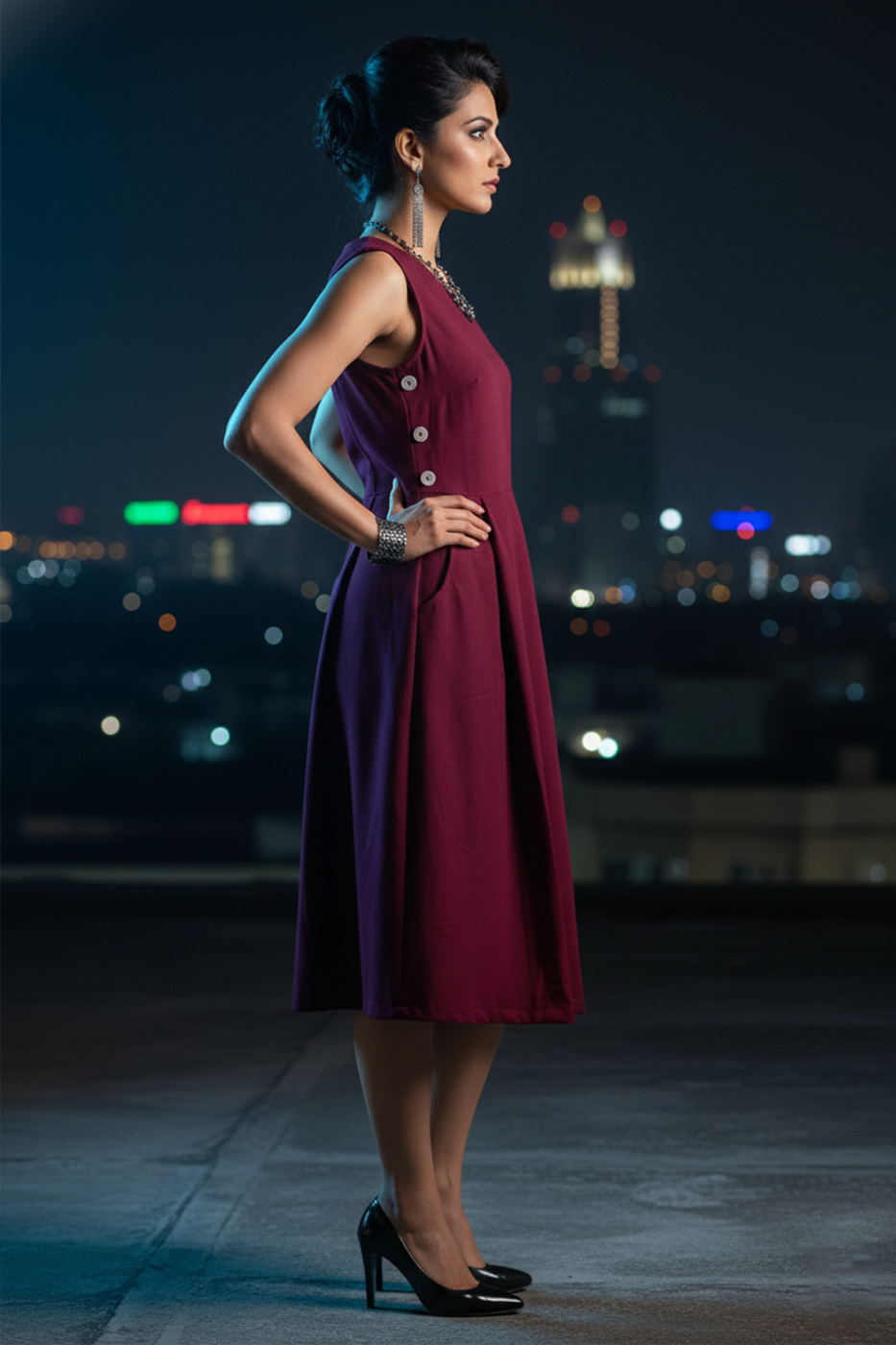 The Carmine Fantasy - Dress is a striking garment crafted from luxurious Silk fabric. This dress features a bold red color, described internally as "Red Dress with White buttons," indicating a vibrant look contrasted with clean detailing. The silk fabric provides a beautiful, fluid drape and natural sheen. This piece is a sophisticated and eye-catching choice for an elevated occasion.