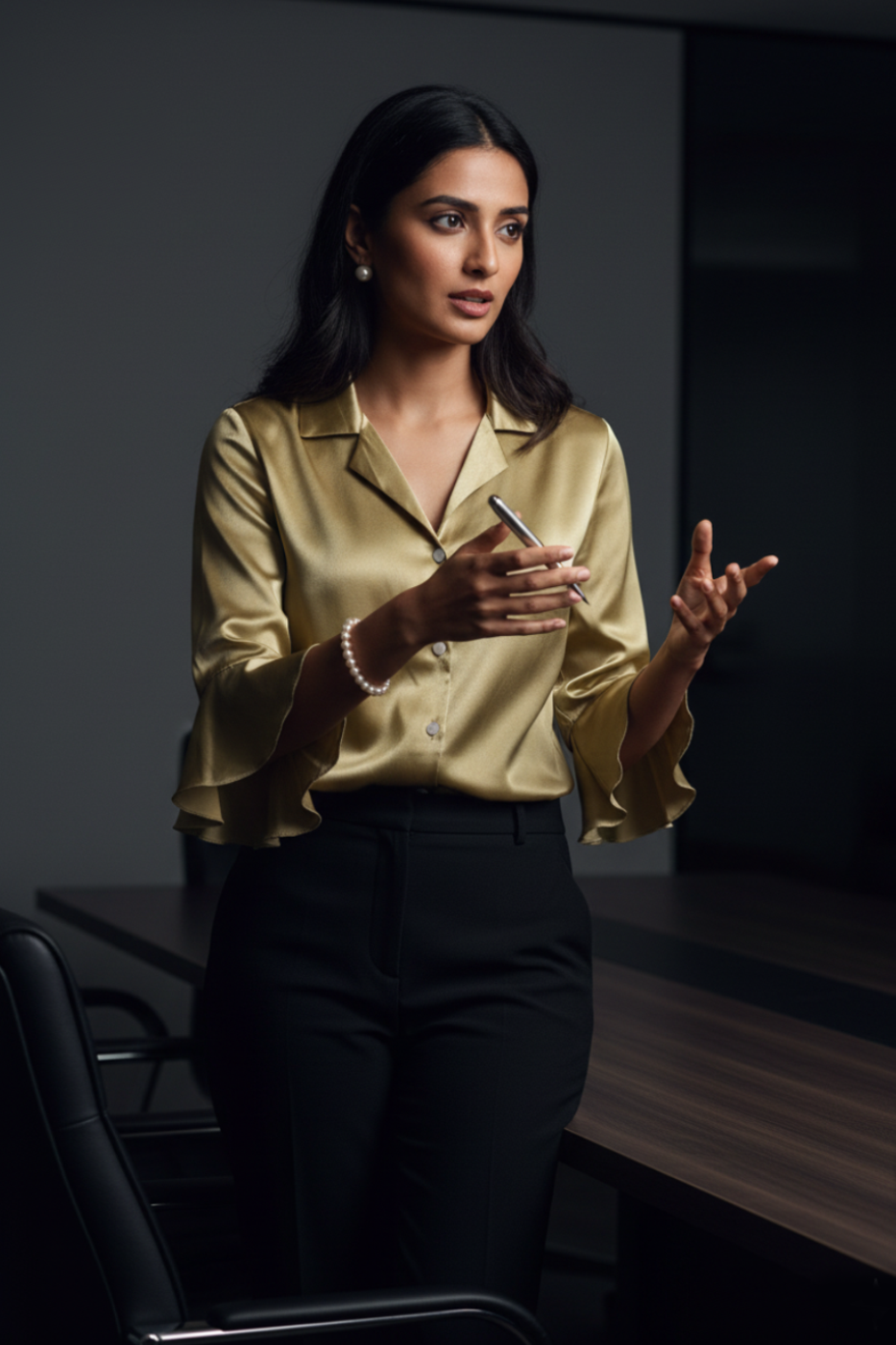 The Sage Ruffle - Shirt is a charming and luxurious top crafted from smooth Satin fabric. It features a muted olive green color and is designed with eye-catching ruffle sleeves that add a touch of feminine flair. The sleek satin material ensures a graceful drape and comfortable wear, making it a sophisticated piece for both casual and dressier occasions.